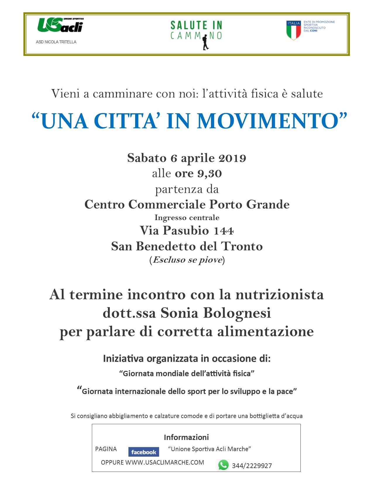 SAN BENEDETTO DEL TRONTO – Sabato 6 aprile (ore 9,30 partenza dal Centro commerciale Porto Grande”) è in programma “Una città in movimento”, iniziativa gratuita di promozione della salute dei cittadini, attraverso una camminata di un’ora circa, in occasione di due importanti ricorrenze.