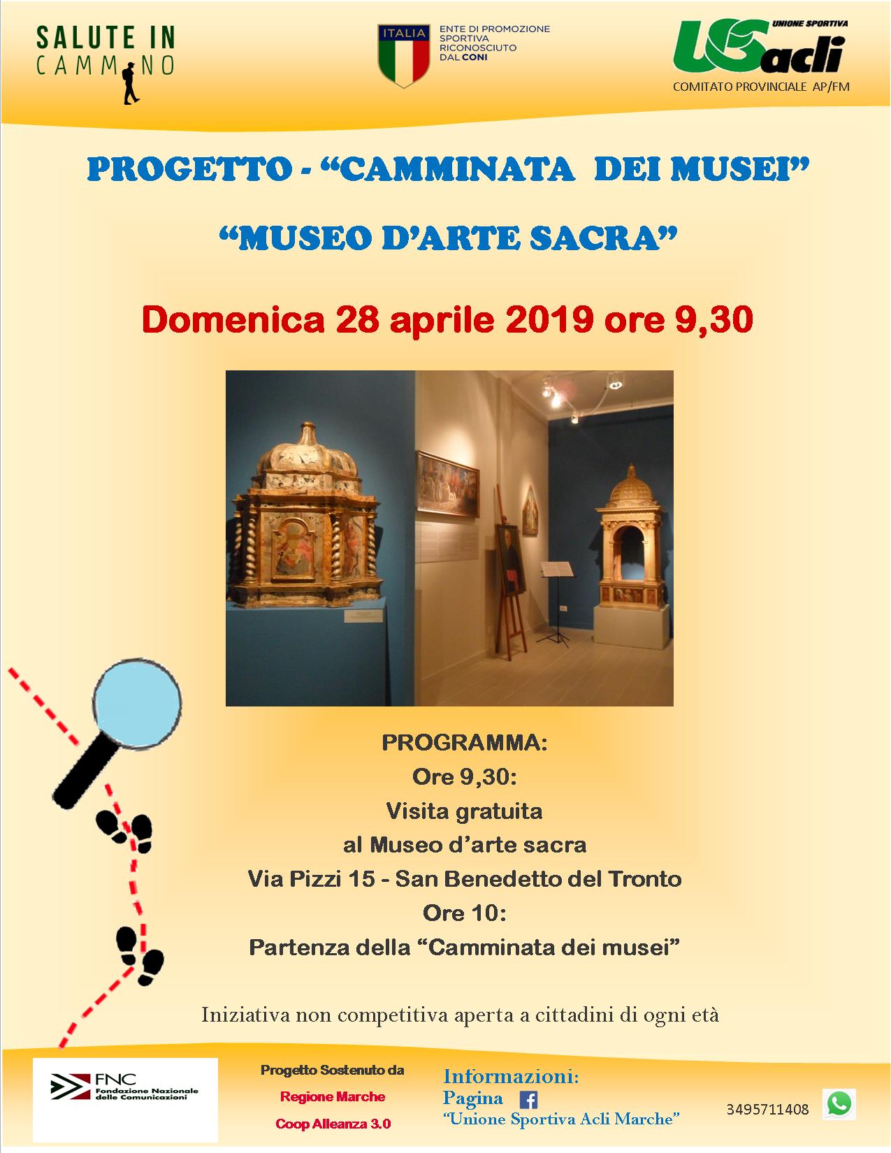 SAN BENEDETTO DEL TRONTO – Farà tappa al “Museo di arte sacra”, in via Pizzi 15, la quarta tappa della quinta edizione del progetto “Camminata dei musei” promosso dall’Unione Sportiva Acli. Si tratta di una iniziativa che sta coinvolgendo sempre più persone e che è finalizzata a promuovere strutture museali che sono fuori da grandi circuiti culturali, ma che hanno delle ricchezze sicuramente da valorizzare.