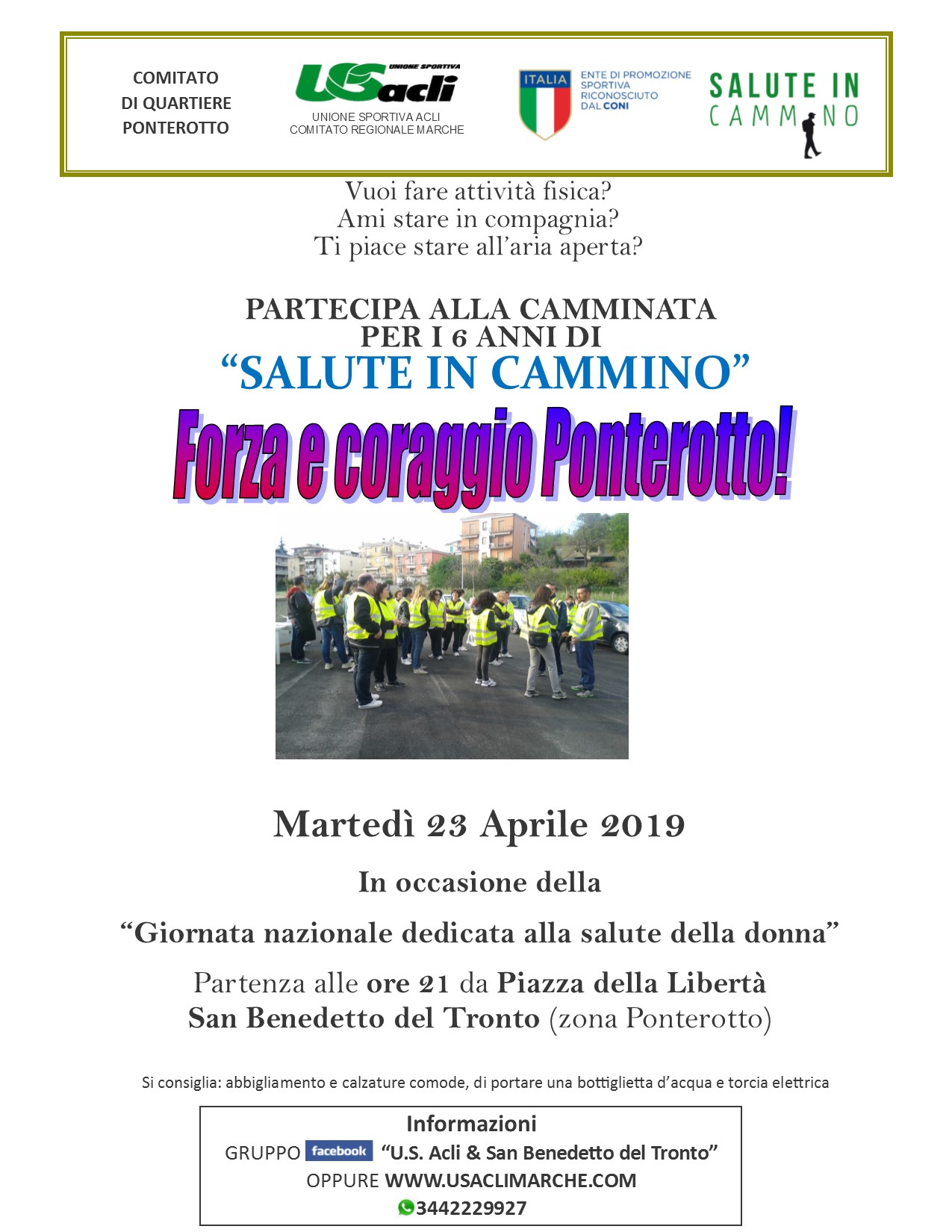 SAN BENEDETTO DEL TRONTO – Spegne 6 candeline l’iniziativa “Salute in cammino” promossa dall’Unione Sportiva Acli Marche. E lo fa con una iniziativa in programma martedì 23 aprile alle ore 21 con partenza dal quartiere Ponterotto, in Piazza della libertà, proprio dove sei anni fa l’iniziativa ha preso il via.