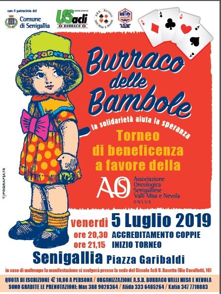 SENIGALLIA – Venerdì 5 luglio in Piazza Garibaldi si terrà il “Burraco delle Bambole” torneo di beneficenza a favore dell’AOS- Associazione Oncologica Senigalliese con il supporto dell’Unione Sportiva Acli Marche – Burraco e dell’ASD Burraco- Valli Misa e Nevola ed il patrocinio dell’amministrazione comunale di Senigallia. L’Associazione Oncologica Senigalliese presta assistenza domiciliare gratuita ai malati oncologici sul territorio di Senigallia e nei Comuni delle Valli Misa e Nevola, con una equipe di medici, infermieri, psicologa, nutrizionista e volontarie domiciliari. Quanti sono interessati a partecipare al torneo sono invitati ad iscriversi al più presto, per motivi organizzativi. Il costo di iscrizione è di € 10 a persona Alle ore 20,30 ci sarà l’accreditamento delle coppie ed alle 21,15 l’inizio del torneo. Per iscrizioni si possono contattare i seguenti referenti: Massimiliano (3889028364), Alida (3336485264) e Katia (3477710883). Al termine del torneo alle coppie vincenti saranno consegnati premi generosamente offerti da diverse attività e per tutte le altre coppie verrà consegnato un ricordo della manifestazione. In caso di maltempo l’iniziativa si svolgerà presso la sede del Circolo Acli Ravetta in via Cavallotti 10 (vicino Piazza Garibaldi). L’Associazione AOS confida in una numerosa partecipazione di persone sensibili a scopi benefici per cui sollecita ad iscriversi, ringraziando anticipatamente quanti parteciperanno.