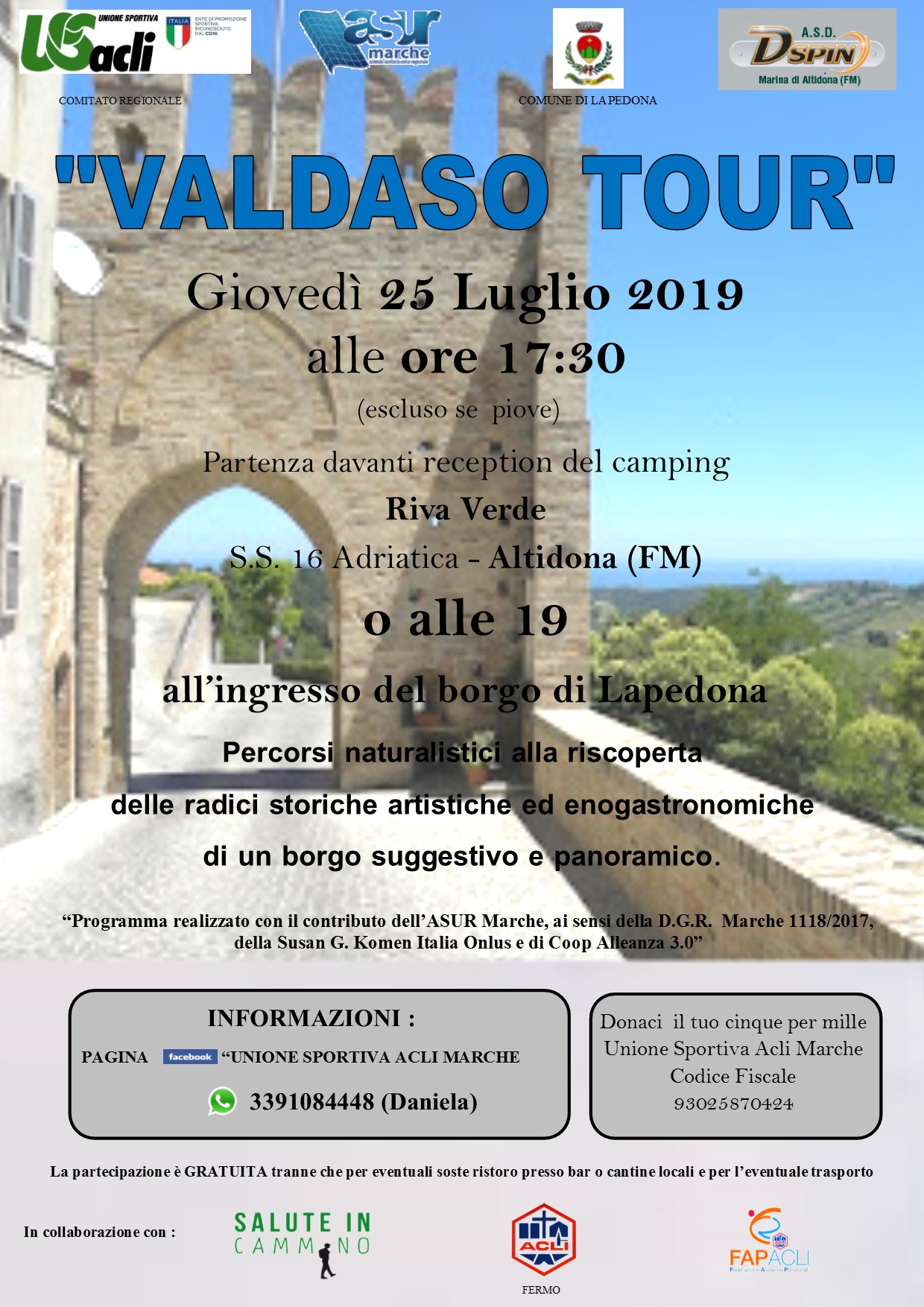 Il programma della giornata di giovedì 25 luglio prevede il ritrovo alle 17,30 presso la reception del Camping Riva Verde ad Altidona o alle 19 all’ingresso del borgo di Lapedona.