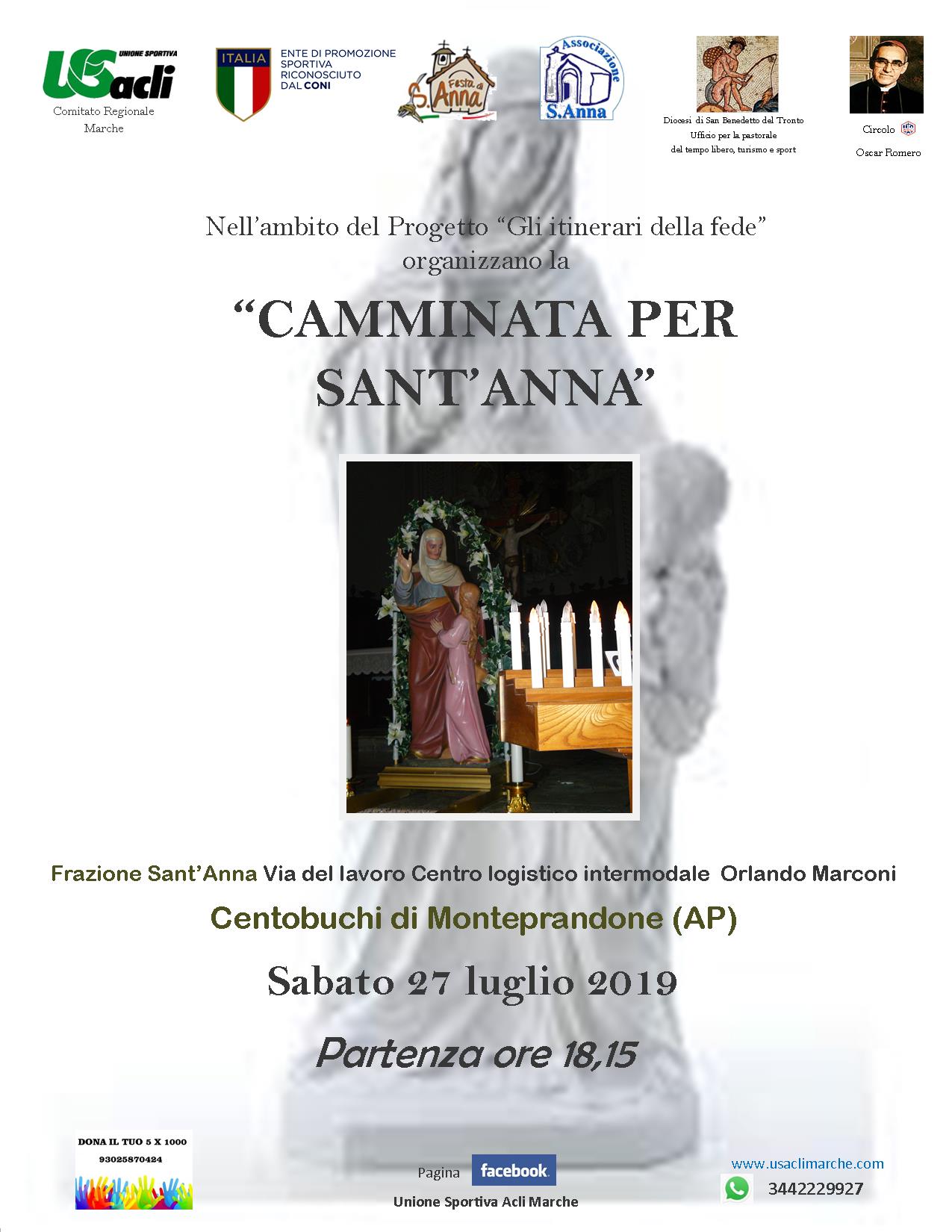 MONTEPRANDONE – E’ in programma per sabato 27 luglio alle ore 18,15 la “Camminata per Sant’Anna” inserita all’interno del progetto “Gli itinerari della fede”. La manifestazione si svolge nella frazione Sant’Anna con una camminata programmata all’interno dei festeggiamenti organizzati dall’omonimo comitato. Il programma dell’iniziativa prevede una camminata aperta a cittadini di ogni età che prenderà il via da via del lavoro presso il Centro logistico Intermodale Orlando Marconi. L’iniziativa è organizzata dal Circolo Acli Oscar Romero e dall’U.S. Acli Marche in collaborazione con la Diocesi di San Benedetto del Tronto (Ufficio per la pastorale del tempo libero, turismo e sport) e con l’Associazione Sant’Anna. Per ulteriori informazioni si possono consultare il sito www.usaclimarche.com oppure la pagina facebook “Unione Sportiva Acli Marche”. La partecipazione alla “Camminata per Sant’Anna” è gratuita.