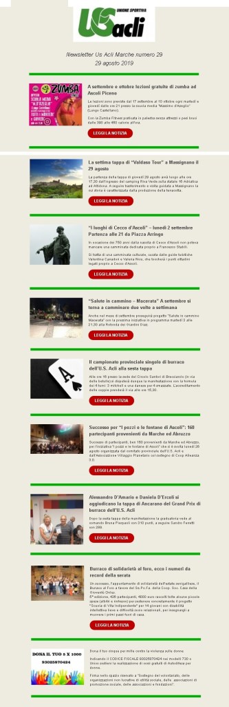 agosto 29, 2019 Unione Sportiva Acli Marche Newsletter n. 29 del 29 agosto 2019 Condividi: Condividi su X (Si apre in una nuova finestra) X Condividi su Facebook (Si apre in una nuova finestra) Facebook Mi piace Caricamento... Correlati