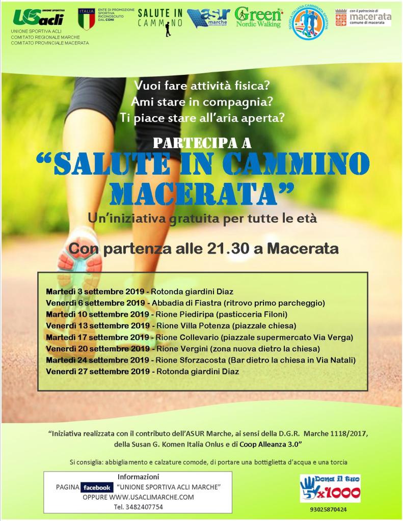 MACERATA – Anche nel mese di settembre proseguirà progetto “Salute in cammino Macerata” con la prossima iniziativa in programma martedì 3 alle 21,30 alla Rotonda dei Giardini Diaz.