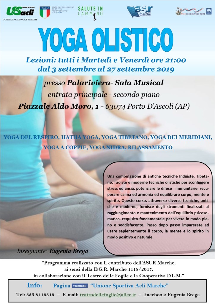 L’Unione Sportiva Acli Marche, nell’ambito del progetto regionale “Sport senza età” dall’Unione Sportiva Acli Marche grazie al contributo dell’Asur Marche (ai sensi della deliberazione di Giunta regionale 1118/2017), col patrocinio dell’amministrazione comunale di San Benedetto del Tronto, in collaborazione con il Teatro delle foglie, ha organizzato un corso di yoga olistico.
