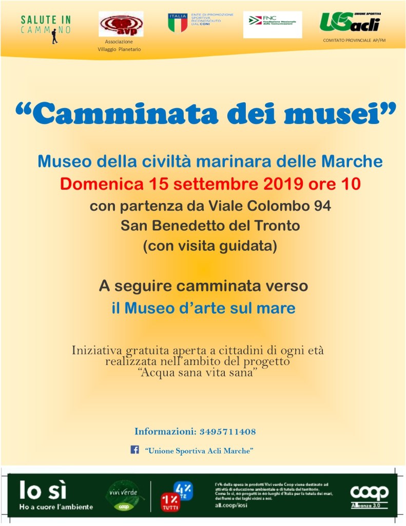 Nell’ambito del progetto “Acqua sana vita sana” domenica 15 settembre, a San Benedetto del Tronto, grazie alla collaborazione di U.S. Acli provinciale e Fondazione Nazionale delle comunicazioni si svolgerà l’iniziativa “Camminata dei musei” che prevede una visita gratuita al Museo della civiltà marinara delle Marche ed a seguire una camminata verso il Museo d’arte sul mare”.