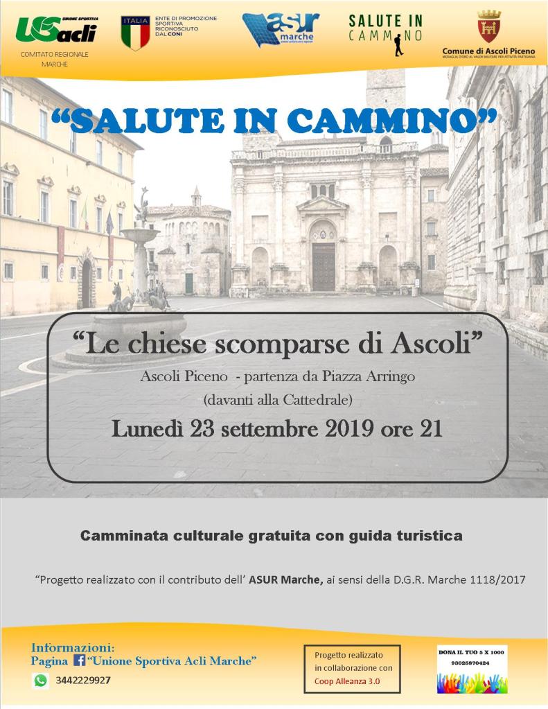 Lunedì 23 settembre ci sarà la consueta camminata culturale dedicata alle chiese scomparse della città. Si parte alle 21 da Piazza Arringo e sarà l’occasione per praticare attività fisica ma anche conoscere meglio la storia della città di Ascoli.