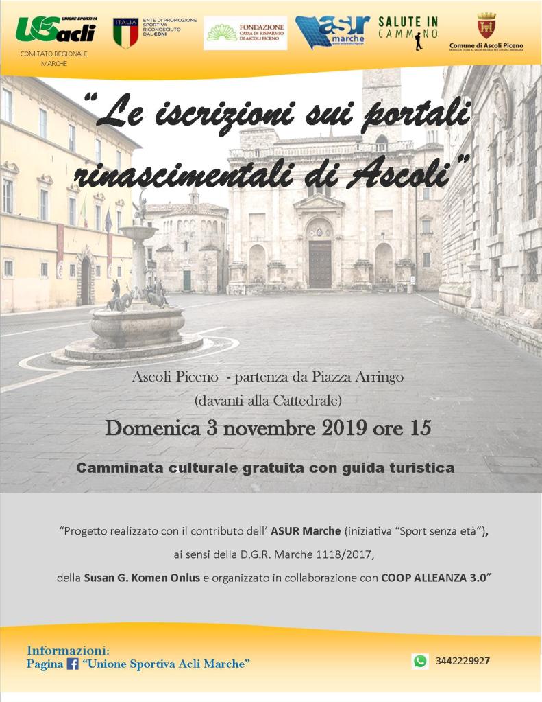 ASCOLI – Nell’ambito del progetto “Salute in cammino – Sport senza età”, iniziativa dell’U.S. Acli Marche che abbina la promozione dell’attività fisica alla valorizzazione ed alla conoscenza del territorio, domenica 3 novembre alle ore 15 (partenza da Piazza Arringo davanti alla Cattedrale) si svolgerà l’iniziativa “Le iscrizioni sui portali rinascimentali di Ascoli”.
