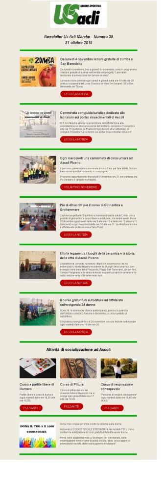ottobre 31, 2019 Unione Sportiva Acli Marche Newsletter n. 38 del 31 ottobre 2019 Condividi: Condividi su X (Si apre in una nuova finestra) X Condividi su Facebook (Si apre in una nuova finestra) Facebook Mi piace Caricamento... Correlati