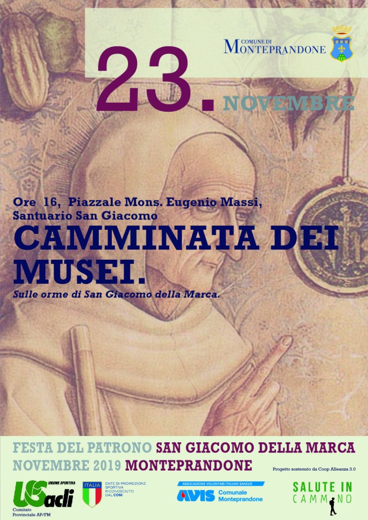 MONTEPRANDONE – Sabato 23 novembre, in occasione delle festività del patrono San Giacomo della Marca, si svolgerà l’undicesima tappa del progetto “Camminata dei musei” con una iniziativa in programma alle ore 16 e con partenza nel Piazzale Monsignor Eugenio Massi.