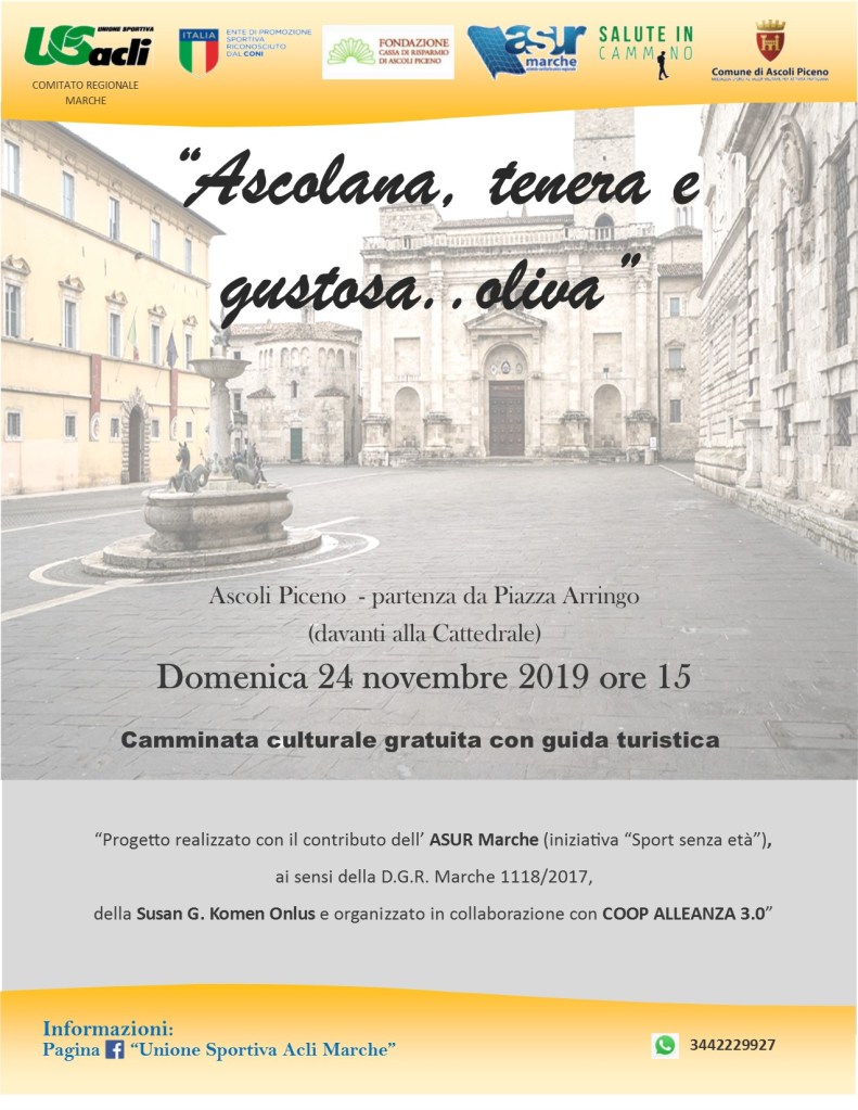 “Ascolana, tenera e gustosa oliva” rientra nel progetto “Sport senza età” che è organizzato dall’Unione Sportiva Acli Marche, col patrocinio dell’amministrazione comunale, col sostegno dell’Asur Marche, della Fondazione Cassa di risparmio di Ascoli Piceno, di Susan G. Komen Onlus e di Coop Alleanza 3.0.
