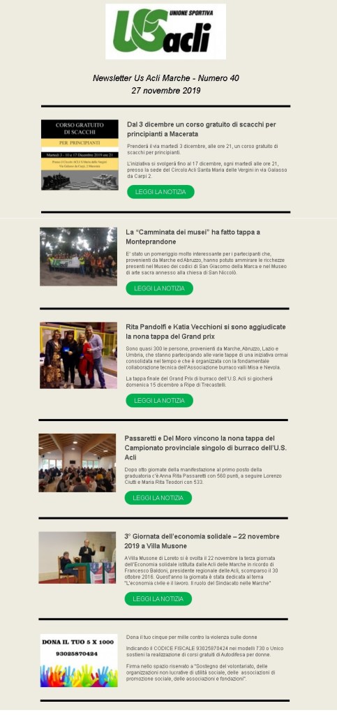 novembre 27, 2019 Unione Sportiva Acli Marche Newsletter n.40 del 27 Novembre 2019 Condividi: Fai clic per condividere su X (Si apre in una nuova finestra) X Fai clic per condividere su Facebook (Si apre in una nuova finestra) Facebook Mi piace Caricamento... Correlati
