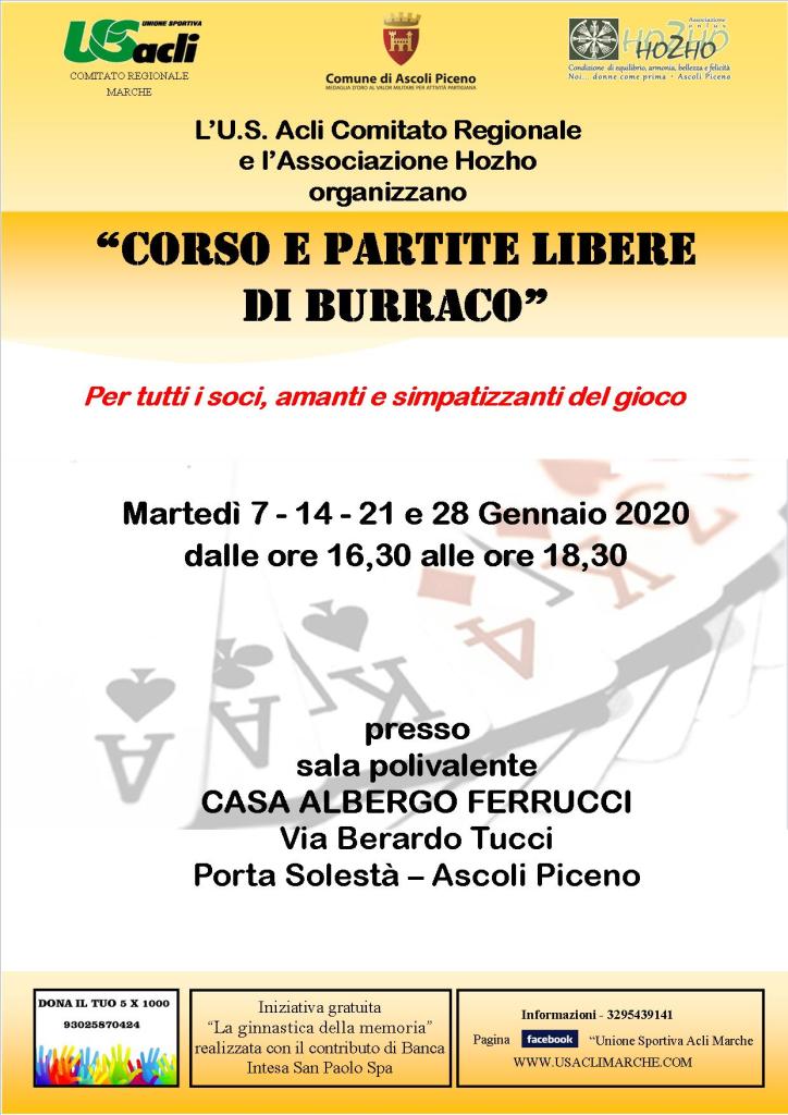 ASCOLI – Anche nel mese di gennaio, presso la sala polivalente della Casa albergo Ferrucci in via Tucci, proseguiranno i corsi e le partite libere di burraco. L’iniziativa si svolgerà ogni martedì dalle ore 16,30 alle ore 18,30 ed è gratuita ed il prossimo appuntamento è dunque fissato per martedì 7 gennaio.