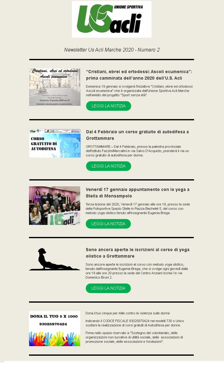 gennaio 16, 2020febbraio 19, 2020 Unione Sportiva Acli Marche Newsletter U.S. Acli Marche 2020 – n.2 Condividi: Condividi su X (Si apre in una nuova finestra) X Condividi su Facebook (Si apre in una nuova finestra) Facebook Mi piace Caricamento... Correlati