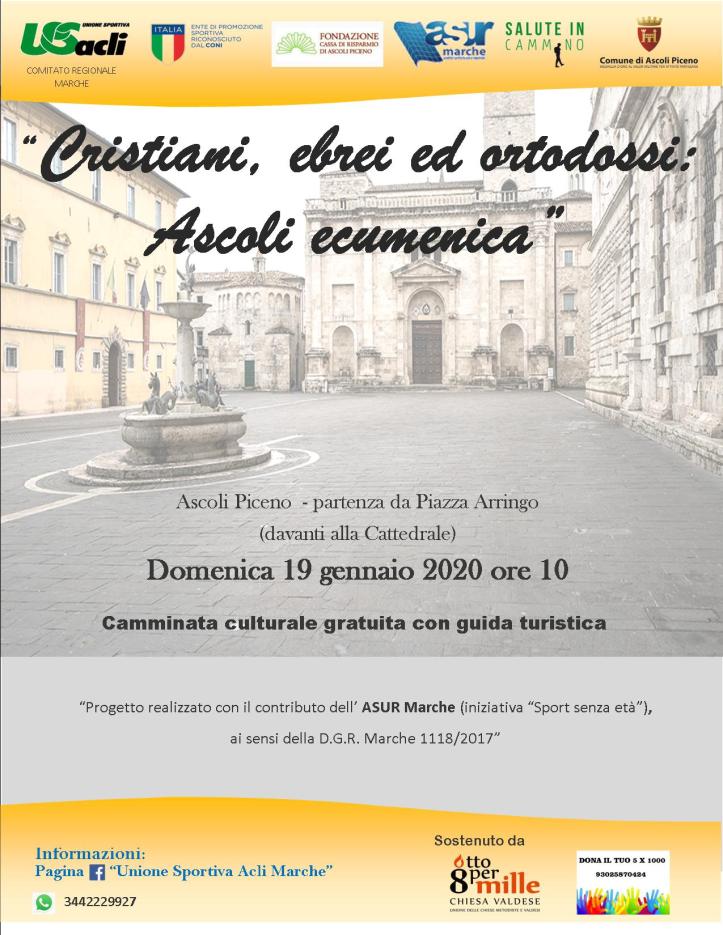 “Cristiani, ebrei ed ortodossi: Ascoli ecumenica” rientra nel progetto “Sport senza età” che è organizzato dall’Unione Sportiva Acli Marche, col patrocinio dell’amministrazione comunale di Ascoli Piceno, col sostegno dell’Asur Marche, della Fondazione Cassa di risparmio di Ascoli Piceno e della Chiesa valdese – Fondi otto per mille.