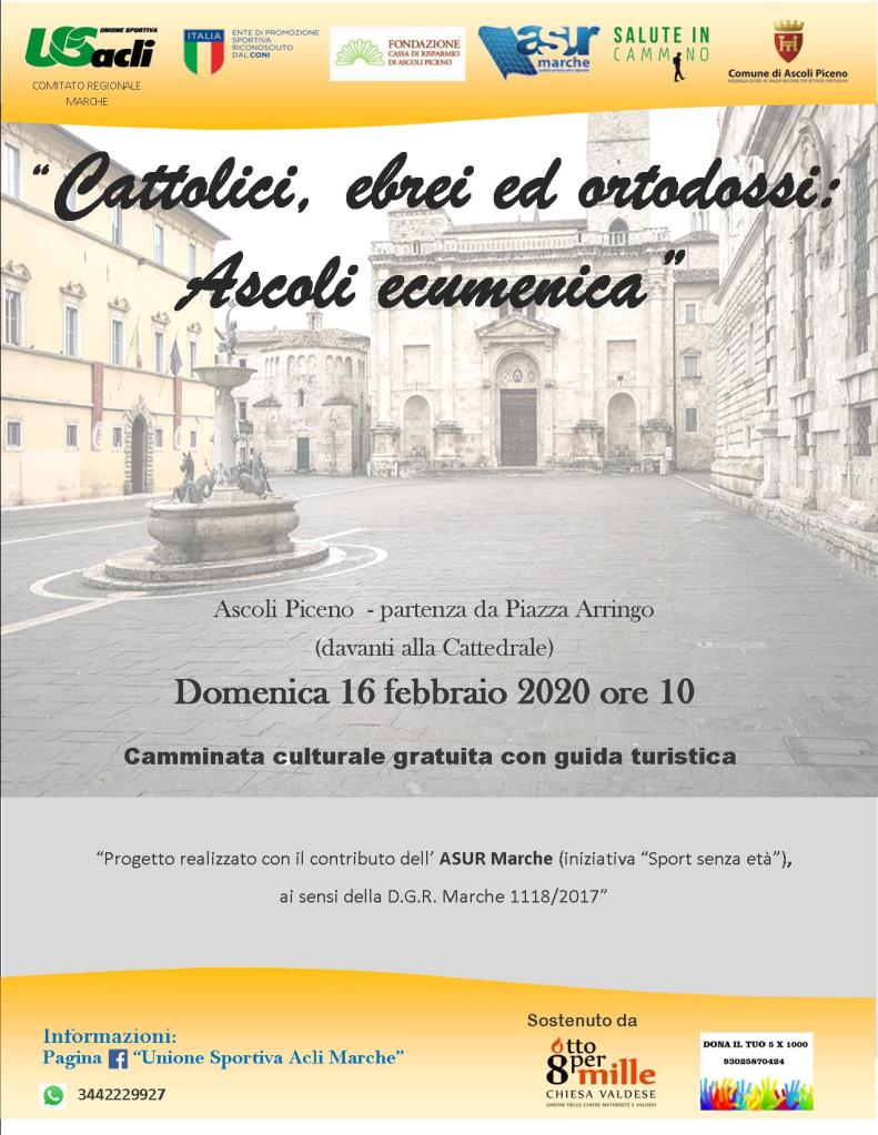 ASCOLI –Domenica 16 febbraio (dopo il rinvio dell’iniziativa del 19 gennaio causa maltempo) si svolgerà l’iniziativa “Cattolici, ebrei ed ortodossi: Ascoli ecumenica” che è organizzata dall’Unione Sportiva Acli Marche nell’ambito del progetto “Sport senza età”.