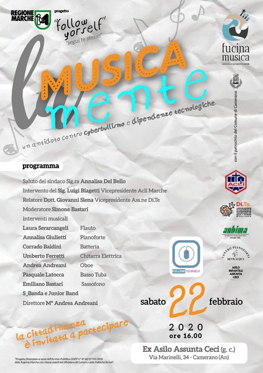 Nell’ambito del progetto delle ACLI Marche “Followyourself – segui te stesso” contro le dipendenze tecnologiche e il cyberbullismo finanziato dalla Regione Marche con i fondi del Terzo settore sarà realizzato a Camerano (An) il 22 febbraio presso l’oratorio Assunta Ceci una iniziativa frutto della collaborazione tra ACLI Marche e Fucina Musica, partner del progetto.