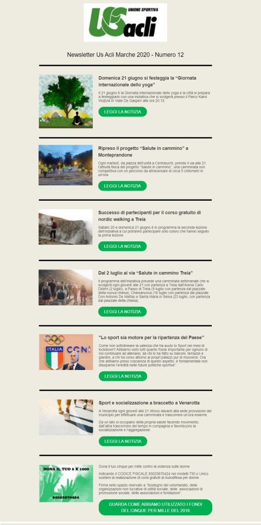 giugno 19, 2020 Unione Sportiva Acli Marche Newsletter n. 12 del 18 giugno 2020 Condividi: Condividi su X (Si apre in una nuova finestra) X Condividi su Facebook (Si apre in una nuova finestra) Facebook Mi piace Caricamento... Correlati