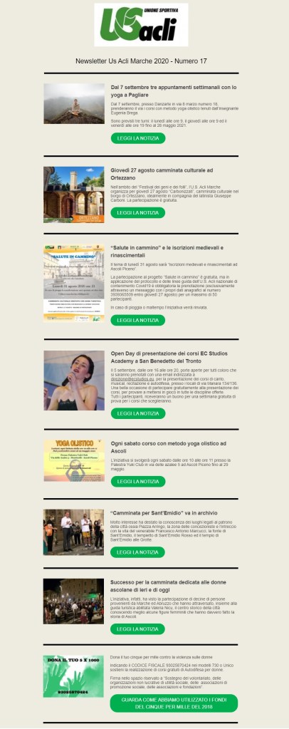 agosto 26, 2020agosto 26, 2020 Unione Sportiva Acli Marche Newsletter n.17 del 26 agosto 2020 Condividi: Fai clic per condividere su X (Si apre in una nuova finestra) X Fai clic per condividere su Facebook (Si apre in una nuova finestra) Facebook Mi piace Caricamento... Correlati