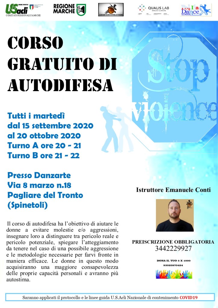 SPINETOLI – Prenderà il via il 15 settembre un corso gratuito di autodifesa diretto dall’istruttore Emanuele Conti. L’iniziativa si svolgerà ogni martedì presso Danzarte (a Pagliare, in via 8 Marzo n. 18) e prevede 2 turni (ore 20/21 o 21/22) fino al 20 ottobre. Il corso è organizzato dall’Unione Sportiva Acli Marche in collaborazione e con il sostegno della Regione Marche, di Ares 2.00 Evolution, di Pol. Ita Dance School, di Qualis Lab – Analisi cliniche e dei Centri antiviolenza delle Marche. Si tratta di una nuova iniziativa di prevenzione della violenza sulle donne che l’Unione Sportiva Acli delle Marche, sin dal 2017, propone nel territorio regionale. Ne sono stati già realizzati 13 con 388 iscritte e 100 ore di lezione nelle province di Ascoli Piceno, Fermo e Pesaro/Urbino. Il corso di autodifesa ha l’obiettivo di aiutare le donne a evitare molestie e/o aggressioni, insegnare loro a distinguere tra pericolo reale e pericolo potenziale, spiegare l’atteggiamento da tenere nel caso di una possibile aggressione e le metodologie necessarie per farvi fronte in maniera efficace. Le donne in questo modo acquisiranno una maggiore consapevolezza delle proprie capacità personali e avranno più autostima. L’iscrizione e la partecipazione sono gratuite, potranno partecipare le prime 15 iscritte per ogni turno. Per la preiscrizione, che è obbligatoria, occorre rivolgersi alla segreteria del corso (3442229927). Per ulteriori informazioni si possono consultare la pagina facebook Unione Sportiva Acli Marche o il sito www.usaclimarche.com . Durante lo svolgimento del corso saranno applicati il protocollo e le linee guida U.S. Acli nazionale di contenimento Covid19.