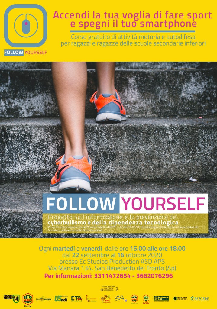 “Accendi la tua voglia di fare sport e spegni il tuo smartphone”. E’ questo l’invito fatto ai ragazzi ed alle ragazze di San Benedetto del Tronto nell’ambito dell’iniziativa “Follow yourself”, un progetto sull’informazione e la prevenzione del cyberbullismo e della dipendenza tecnologica finanziato ai sensi dall’Avviso pubblico DDPF n. 47 del 7 maggio 2018 della Regione Marche con risorse statali del Ministero del Lavoro e delle politiche sociali.