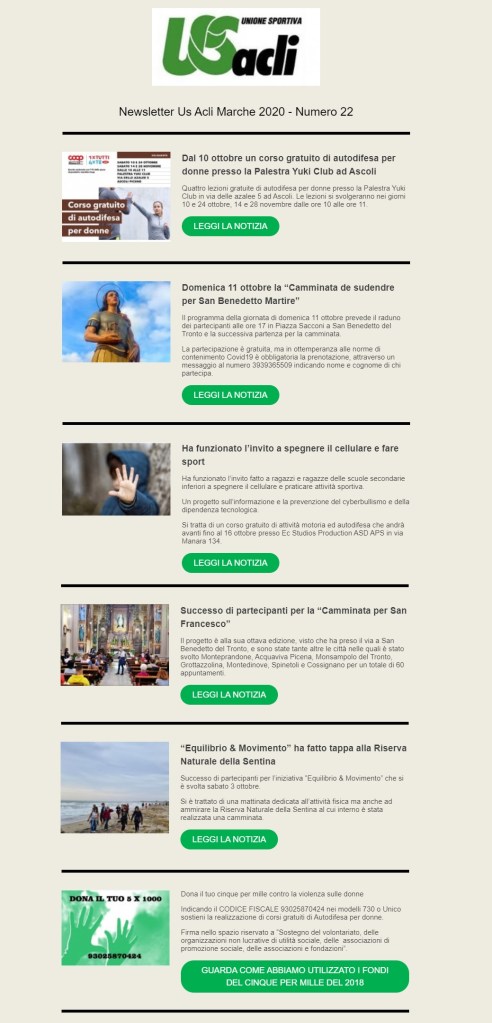 ottobre 8, 2020 Unione Sportiva Acli Marche Newsletter n. 22 del’8 Ottobre 2020 Condividi: Condividi su X (Si apre in una nuova finestra) X Condividi su Facebook (Si apre in una nuova finestra) Facebook Mi piace Caricamento... Correlati