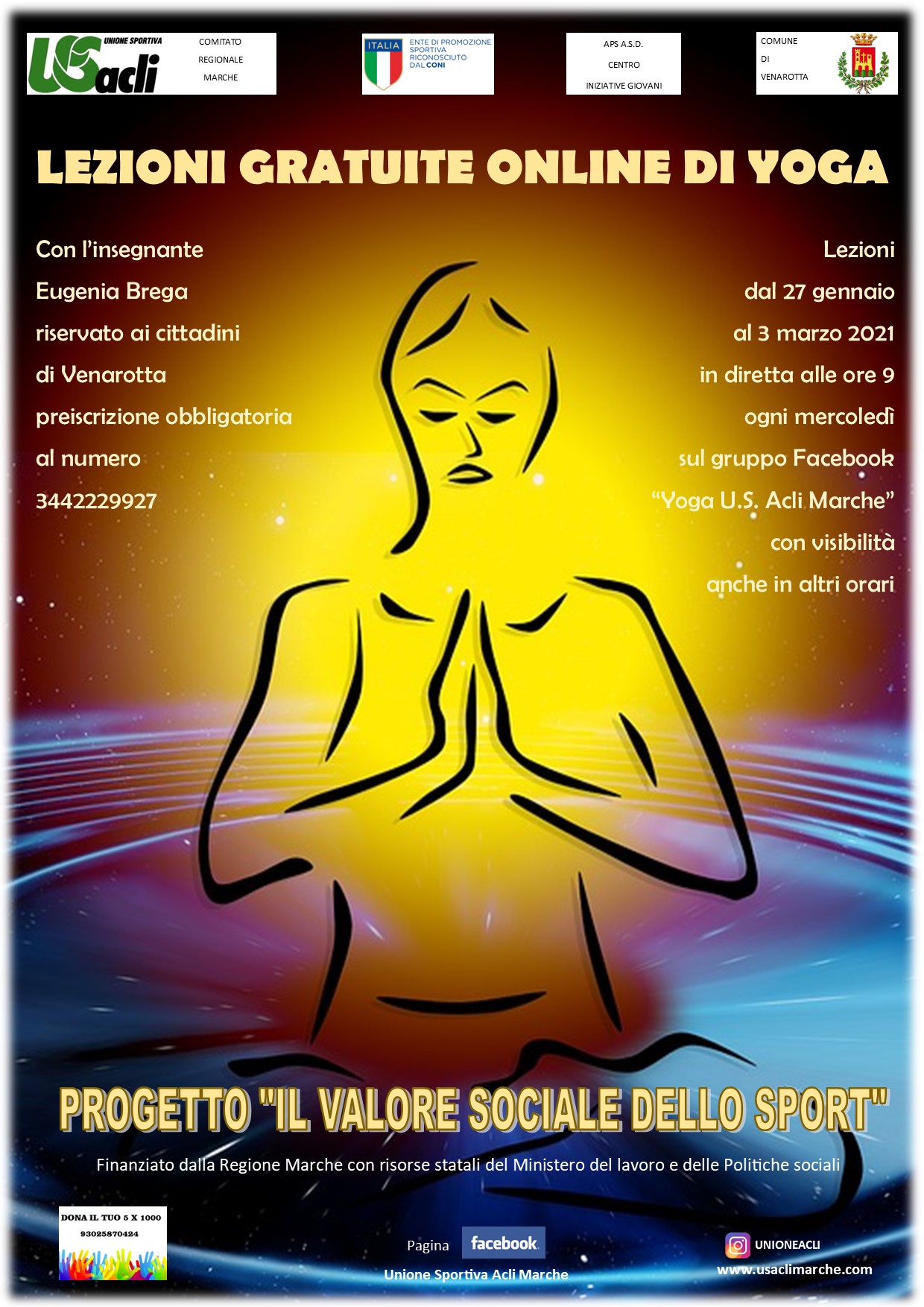 VENAROTTA – Sei lezioni gratuite on line di yoga per cittadini residenti a Venarotta. Le lezioni prenderanno il via, nell’ambito del progetto “Il valore sociale dello sport”, il 27 gennaio e proseguiranno fino al 3 marzo in diretta alle 9 ogni mercoledì sul gruppo facebook “Yoga U.S. Acli Marche” (con visibilità possibile anche in altri orari).
