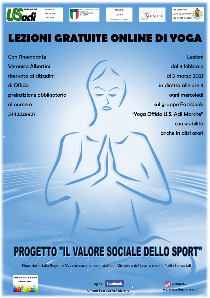 Dal 3 febbraio al 3 marzo, infatti, si svolgeranno 5 lezioni gratuite on line di yoga per cittadini residenti a Offida. Le lezioni si svolgeranno in diretta alle 9 ogni mercoledì sul gruppo facebook “Yoga Offida U.S. Acli Marche” (con visibilità possibile anche in altri orari).