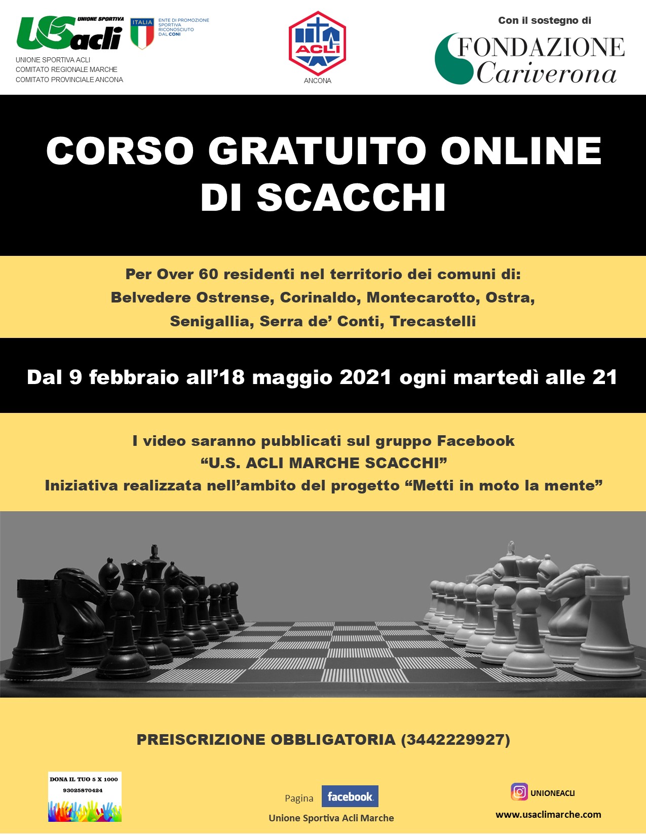 Il corso gratuito on line di scacchi viene realizzato nell’ambito del progetto “Metti in moto la mente” che l’Unione Sportiva Acli Marche ha presentato alla Fondazione Cariverona, nell’ambito del bando Servizi di prossimità dell’anno 2019.
