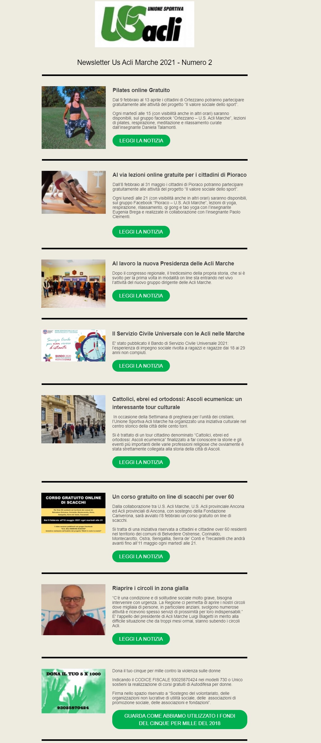 gennaio 28, 2021 Unione Sportiva Acli Marche Newsletter n.2 del 28 gennaio 2021 Condividi: Fai clic per condividere su X (Si apre in una nuova finestra) X Fai clic per condividere su Facebook (Si apre in una nuova finestra) Facebook Mi piace Caricamento... Correlati