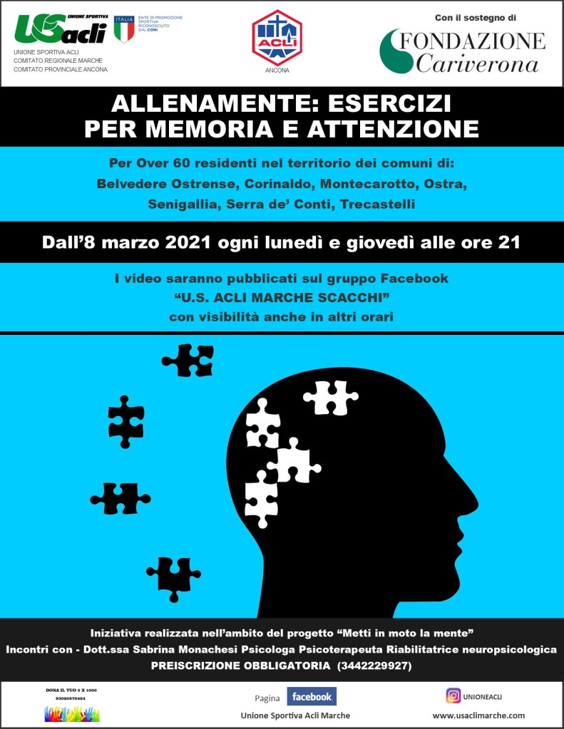 SENIGALLIA – Lunedì 8 marzo prenderà il via “Allenamente”, una nuova iniziativa del progetto “Metti in moto la mente” promosso da U.S. Acli Marche APS, U.S. Acli provinciale Ancona APS ed Acli provinciali di Ancona APS, con sostegno della Fondazione Cariverona.