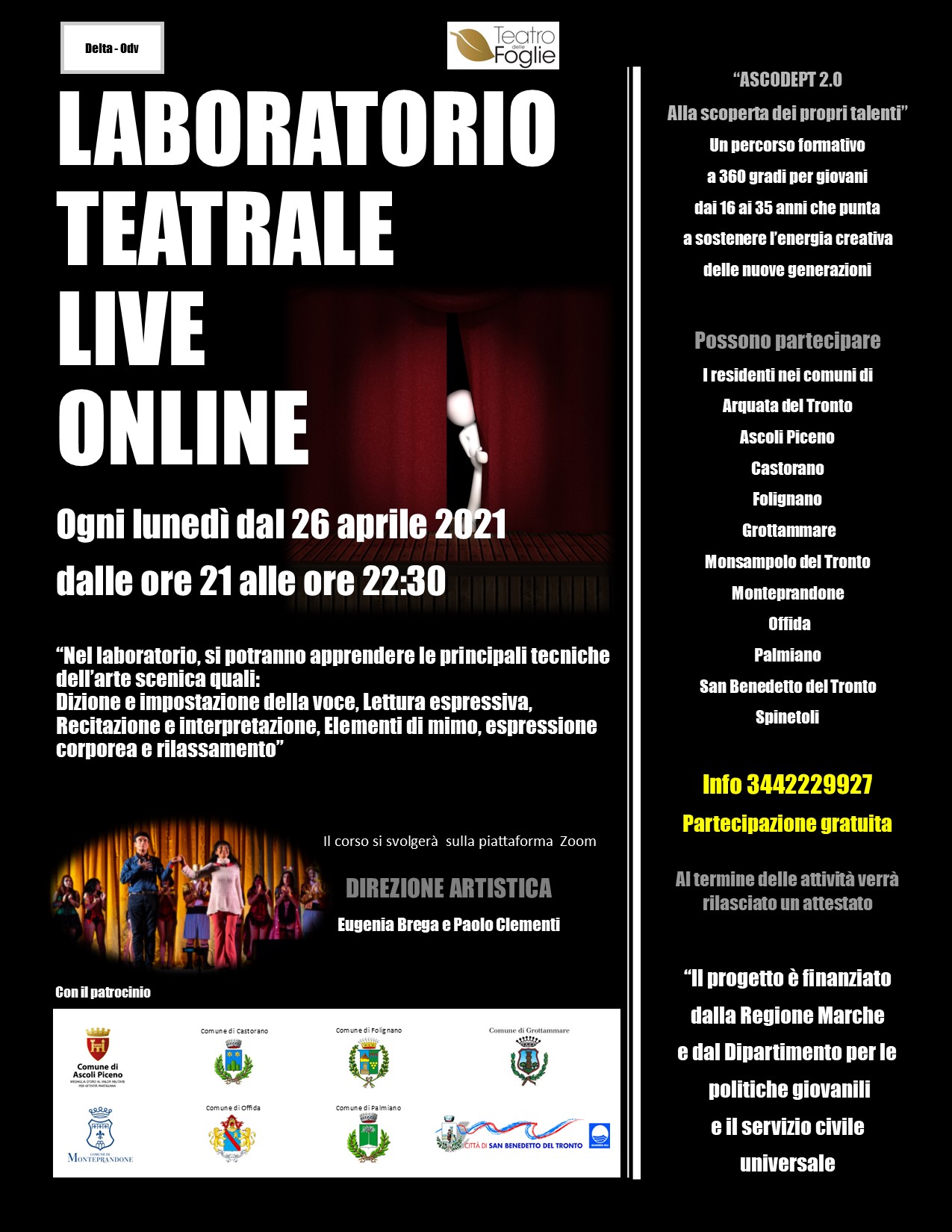 ASCOLI – Prenderà il via lunedì 26 Aprile un laboratorio gratuito teatrale che si svolgerà in modalità live ed on line.