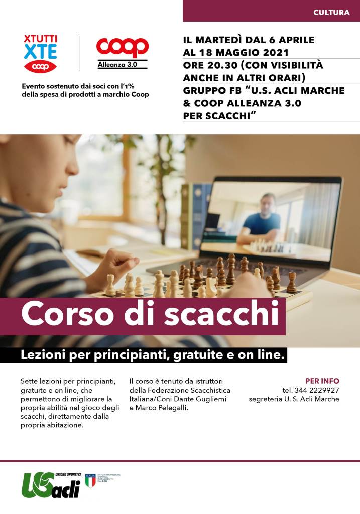 Le lezioni sono diffuse fino al 18 maggio ogni martedì alle ore 20,30 (con visibilità anche in altri orari per permetterne la fruizione di più persone possibili) sul gruppo facebook “U.S. ACLI MARCHE COOP ALLEANZA 3.0 PER SCACCHI”.