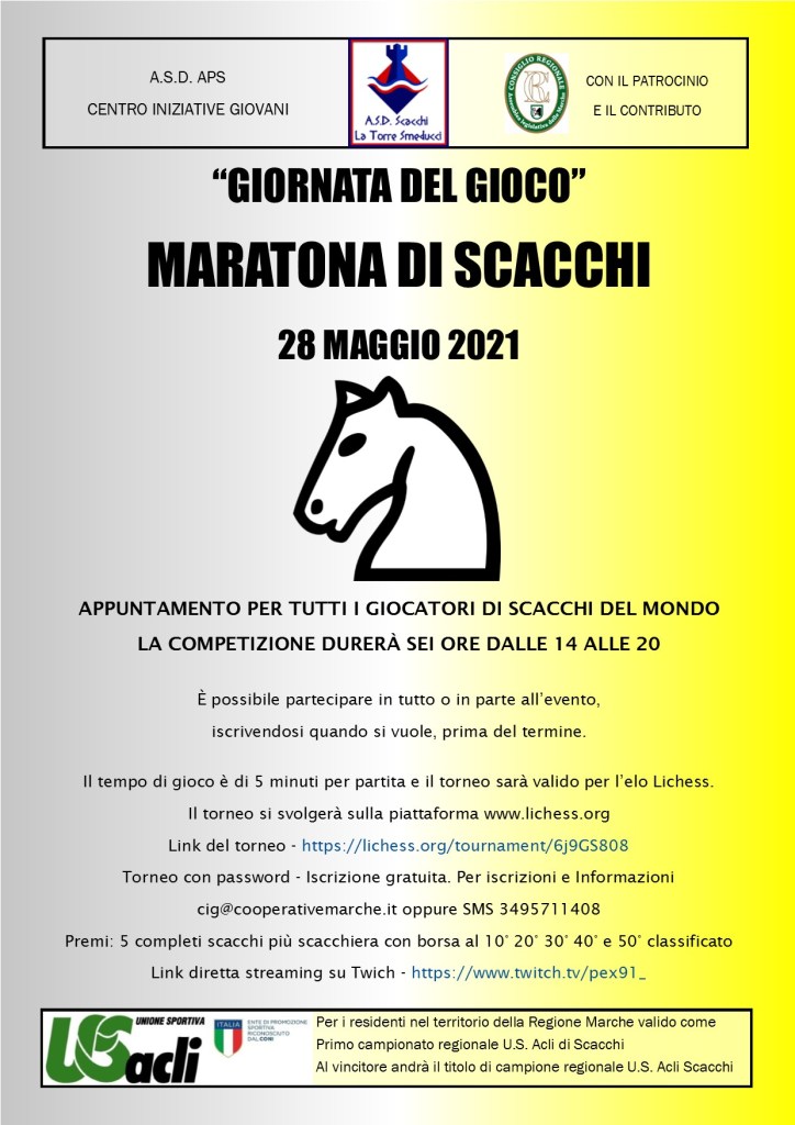 Il link del torneo è https://lichess.org/tournament/6j9GS808, la manifestazione sarà trasmessa in diretta streaming su Twich al link: https://www.twitch.tv/pex91_ .