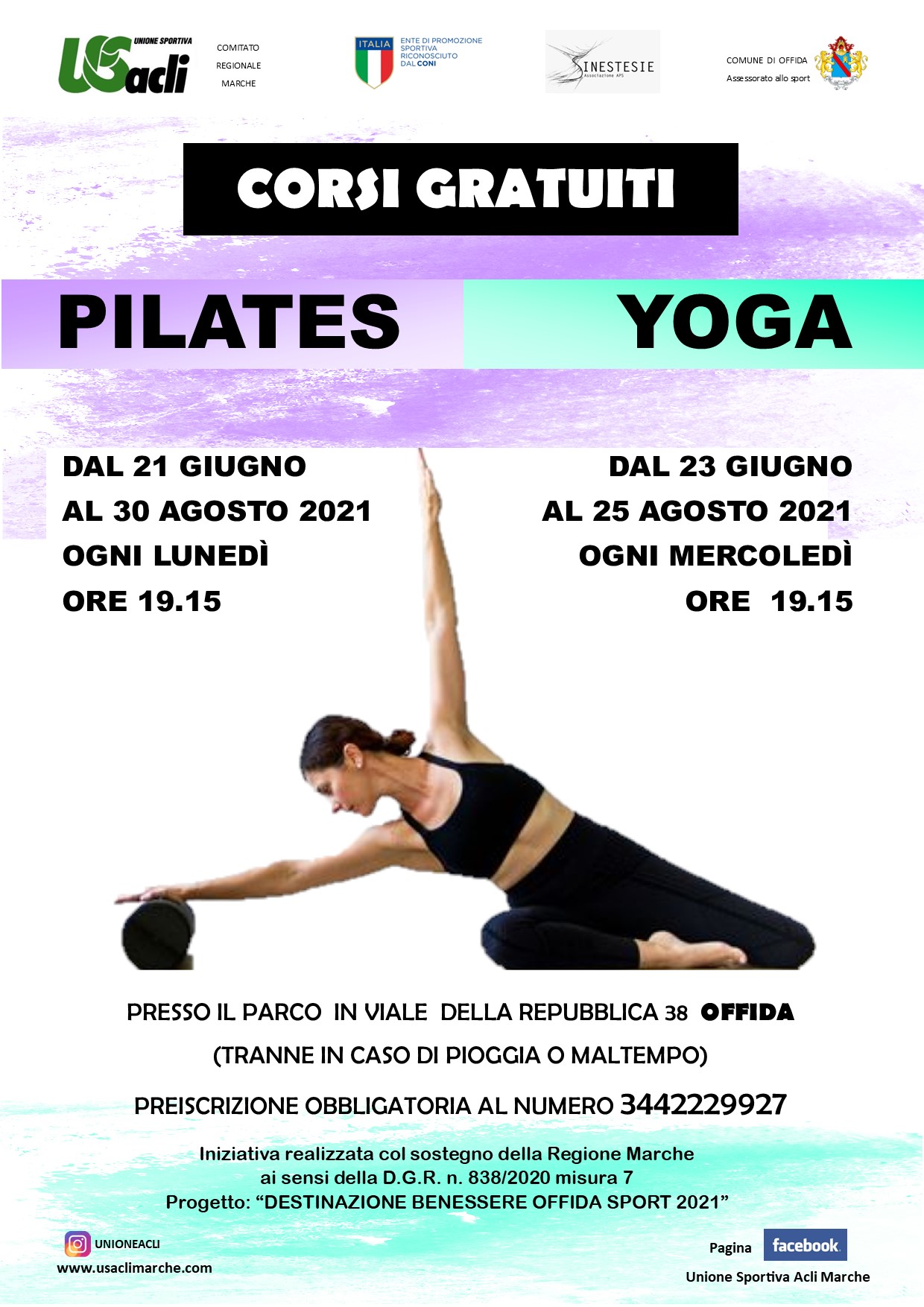 L’iniziativa, coordinata dall’U.S. Acli Marche e realizzata dall’Associazione Sinestesie APS, prevede la realizzazione di corsi gratuiti di Pilates e Yoga presso il parco di Viale della repubblica 38 ad Offida (tranne in caso di pioggia o di maltempo).