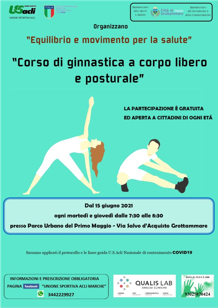 Si tratta di un corso gratuito di ginnastica a corpo libero e posturale, giunto alla terza edizione, aperto a cittadini di ogni età organizzato dagli assessorati alla salute, allo sport, all’inclusione e alla comunicazione del Comune di Grottammare, dall’Unione Sportiva Acli Marche con la collaborazione di Qualis Lab – Ormodiagnostica.