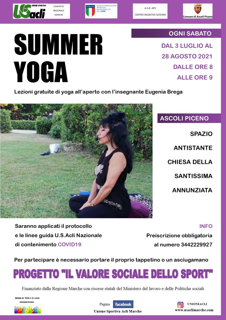 ASCOLI – Dal 3 luglio al 28 agosto, ogni sabato dalle ore 8 alle ore 9, nello spazio antistante la chiesa della Santissima Annunziata si svolgeranno lezioni gratuite di yoga tenute dall’insegnante Eugenia Brega.