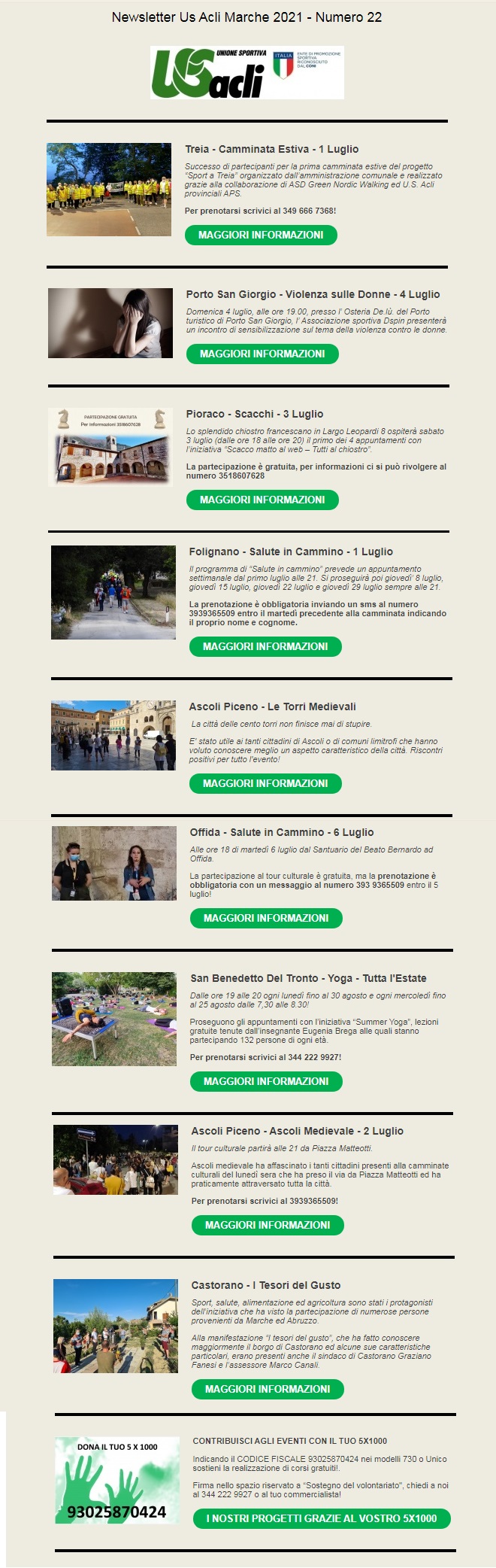 luglio 1, 2021 Unione Sportiva Acli Marche Newsletter n, 22 del 30 Giugno 2021 Condividi: Fai clic per condividere su X (Si apre in una nuova finestra) X Fai clic per condividere su Facebook (Si apre in una nuova finestra) Facebook Mi piace Caricamento... Correlati