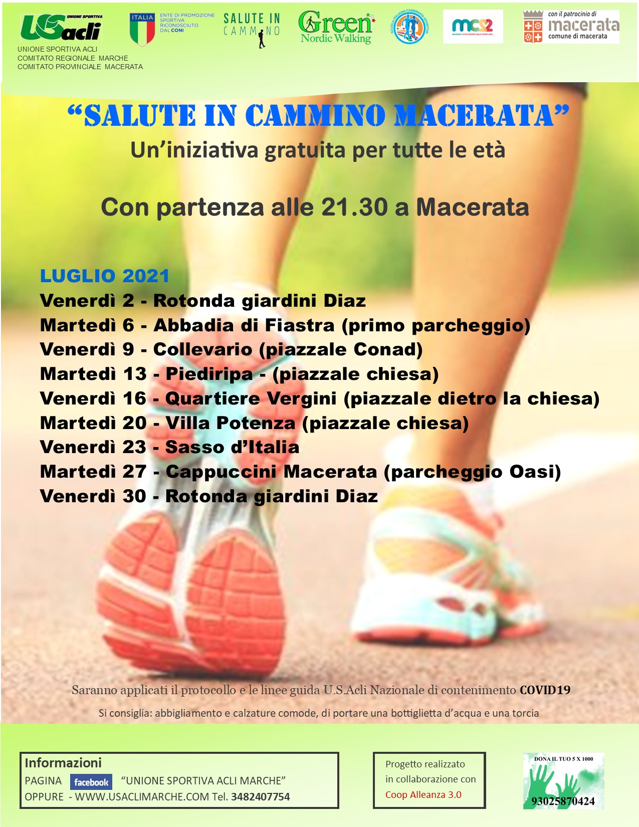 “Salute in cammino” è una iniziativa organizzata dall’U.S. Acli Marche, dall’U.S. Acli provinciale di Macerata, dalla Scuola italiana di camminata sportiva e dall’Asd Green Nordic Walking col patrocinio dell’amministrazione comunale di Macerata, e realizzato grazie ad un contributo di Coop Alleanza 3.0.