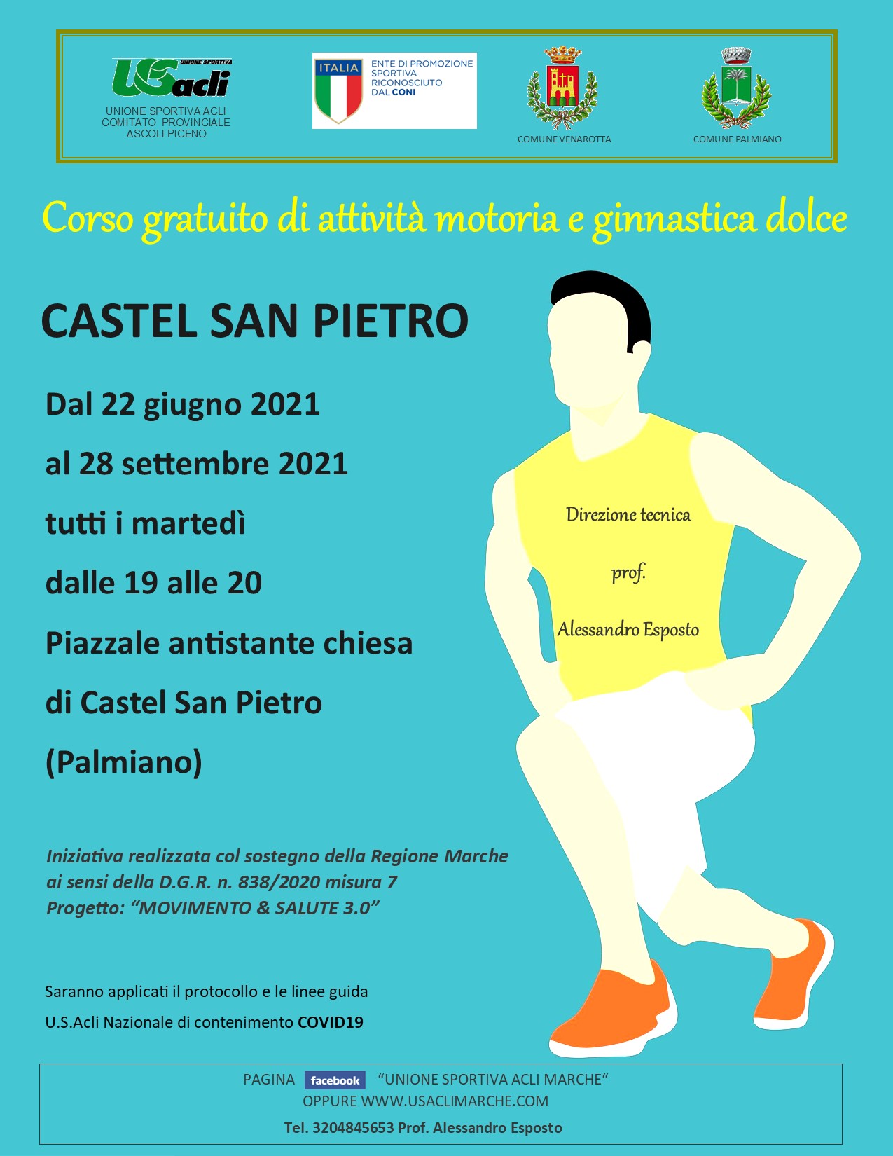 PALMIANO – Ha preso il via, nell’ambito del progetto Movimento & Salute 3.0” che viene organizzato dall’U.S. Acli provinciale e dalle amministrazioni comunali di Palmiano e Venarotta col sostegno della Regione Marche, ai sensi della Deliberazione di Giunta Regionale n. 838/2020 (Misura 7), un corso gratuito di attività motoria e ginnastica dolce.