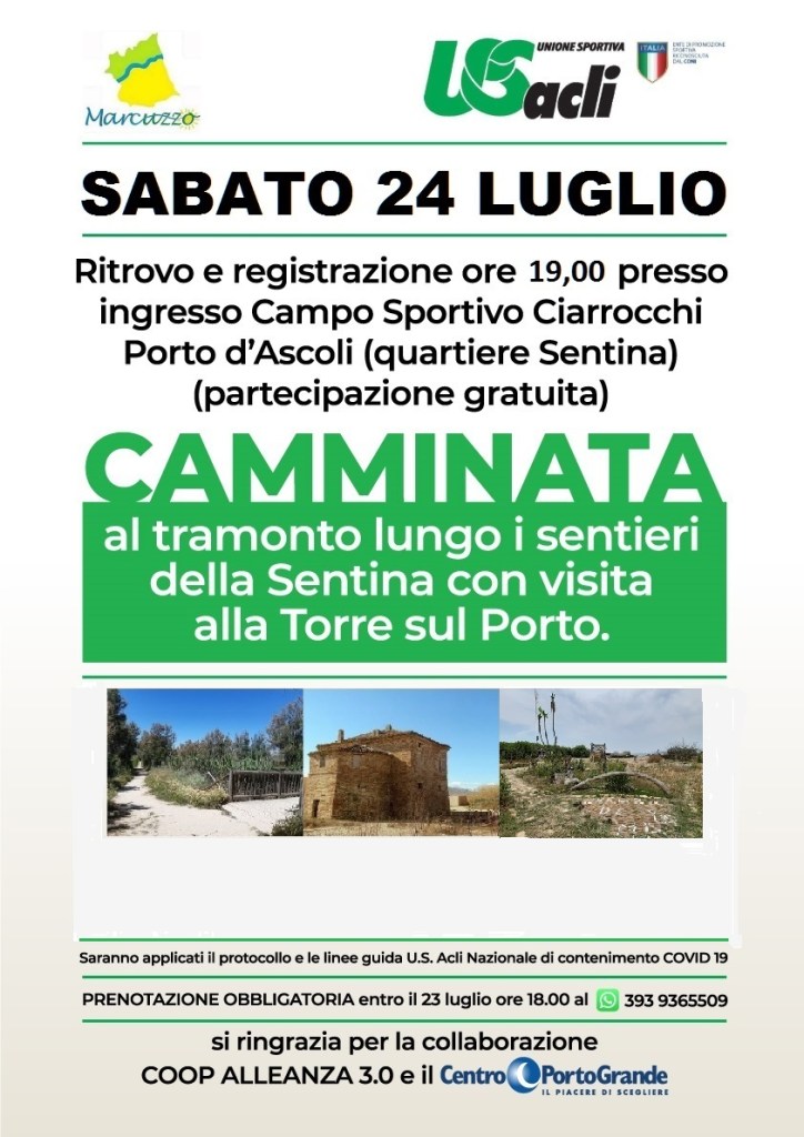 SAN BENEDETTO DEL TRONTO – L’Associazione il Marcuzzo e l’Unione Sportiva Acli Marche organizzano, per sabato 24 luglio, a partire dalle ore 19,00 la “Camminata al tramonto lungo i sentieri della Sentina con visita alla storica Torre sul Porto” .Saranno percorsi alcuni sentieri della Riserva Naturale della Sentina per poi arrivare alla torre dove si potranno ammirare i laghetti con la fauna ricca di diverse specie di uccelli, e la variegata flora presente negli ecosistemi dunali, negli ambienti umidi retrodunali e nelle zone salate retrodunali e la famosa liquirizia.