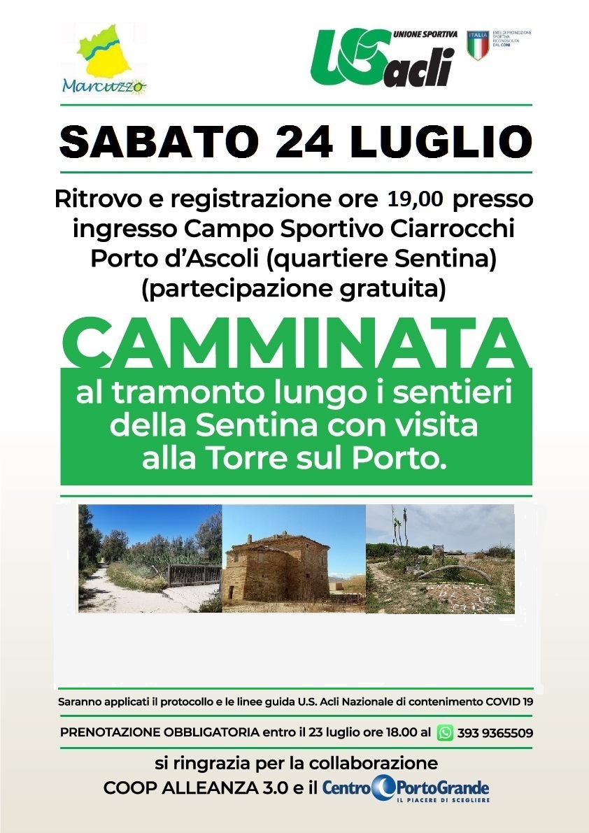 SAN BENEDETTO DEL TRONTO – Sono ancora aperte le iscrizione alla “Camminata al tramonto lungo i sentieri della Sentina” in programma per sabato 24 luglio, a partire dalle ore 19,00.