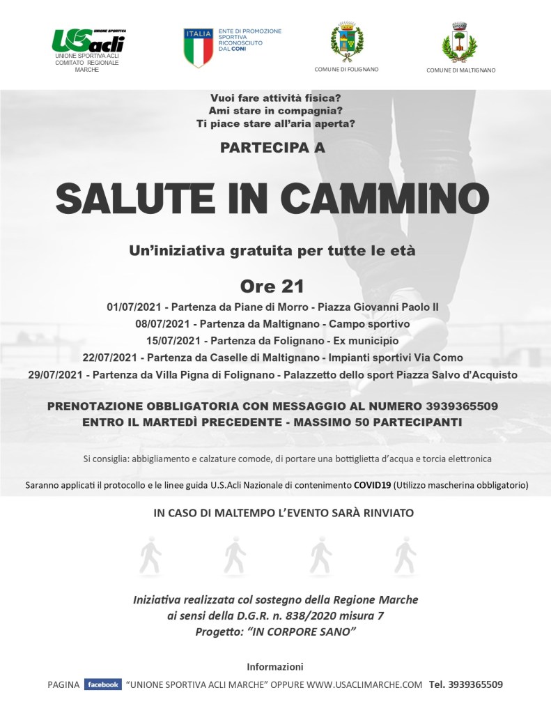 FOLIGNANO – Nell’ambito del progetto “In corpore sano”, finanziato dalla Regione Marche, ai sensi della L.R. 5/2012 ai comuni di Folignano e Maltignano, giovedì 29 luglio si svolgerà la manifestazione “Salute in cammino”.