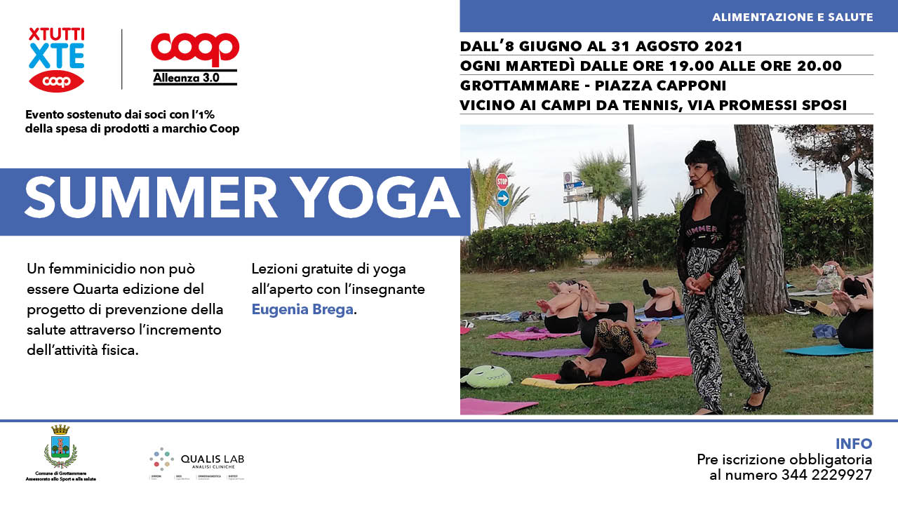Per il 2021 “Summer Yoga” viene realizzata grazie al contributo dell’assessorato alla salute ed allo sport del Comune di Grottammare, della Fondazione Nazionale delle comunicazioni, di Qualis Lab e di Coop Alleanza 3.0 (il progetto viene infatti sostenuto dai soci con l’1% della spesa di prodotti a marchio Coop).