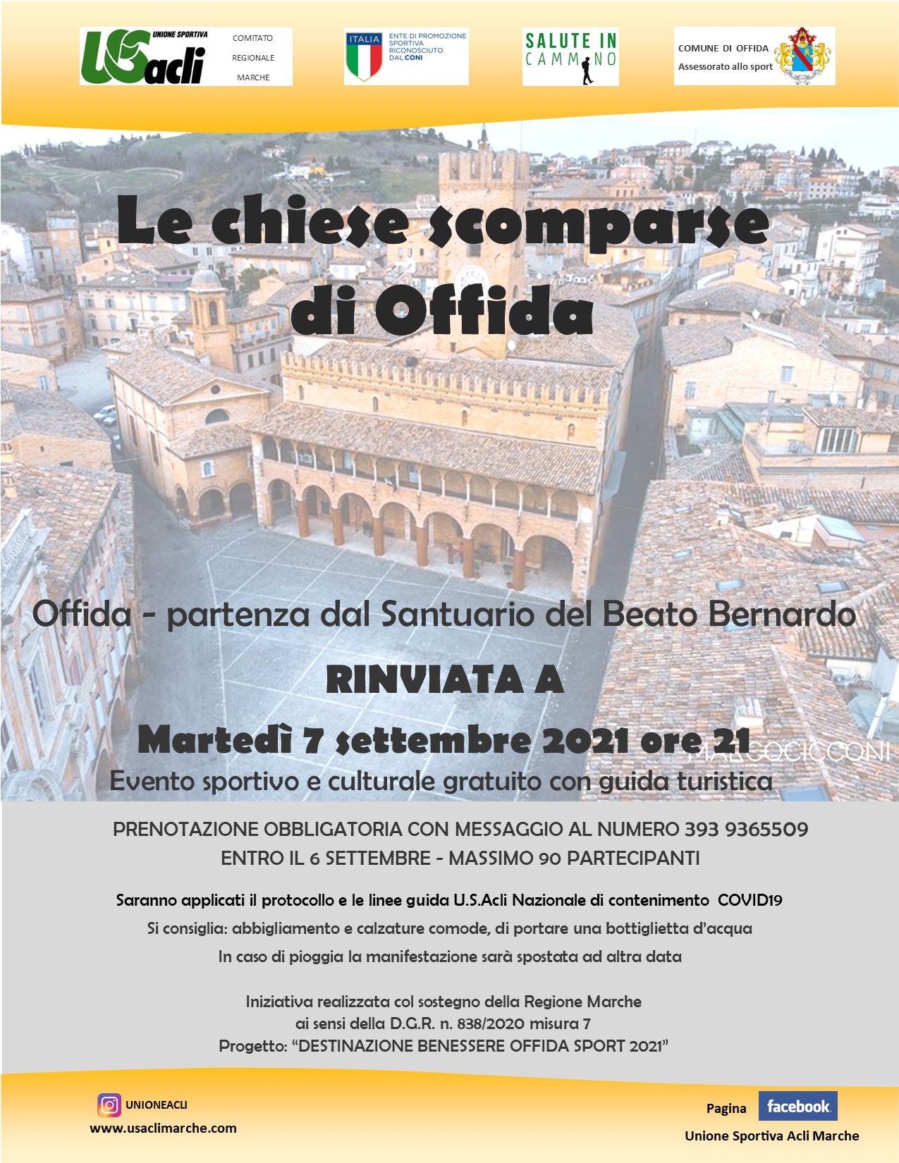 OFFIDA – Dopo il rinvio, causa maltempo di martedì 24 e martedì 31 agosto, “Le chiese scomparse di Offida” si svolgerà martedì 7 settembre alle ore 21 con partenza davanti al Santuario del Beato Bernardo in Piazza Beato Bernardo.