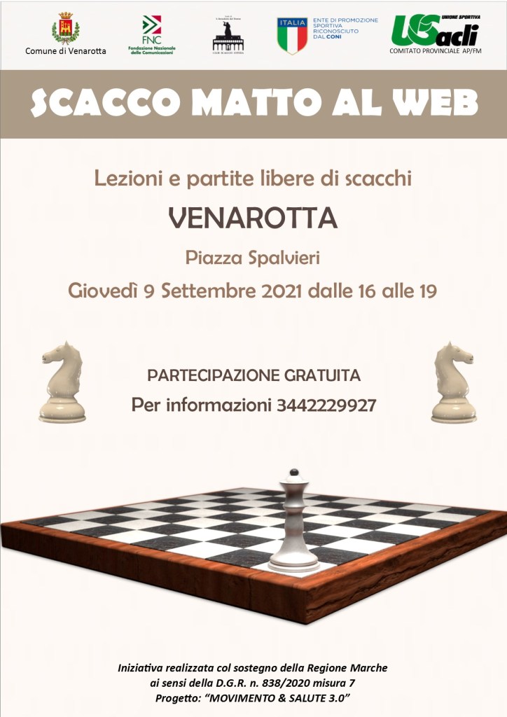VENAROTTA – Giovedì 9 settembre, dalle ore 16 alle ore 19 in Piazza Spalvieri, si svolgerà “Scatto matto al web” con lezioni e partite libere di scacchi per persone di ogni età.