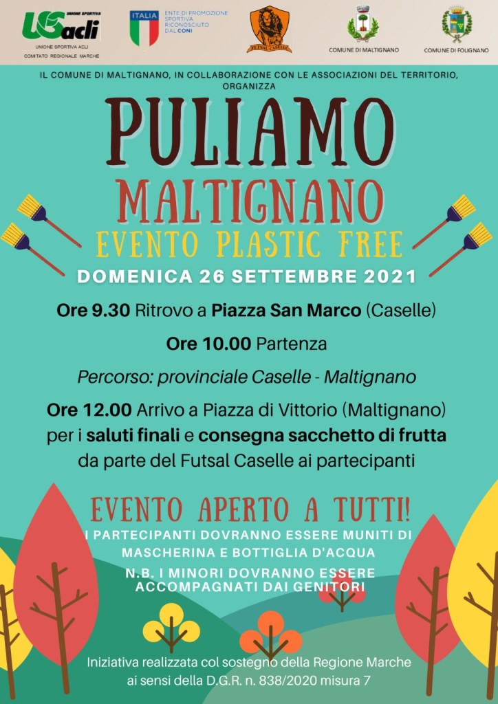 Domenica 26 settembre, con raduno in Piazza San Marco a Caselle di Maltignano alle 9,30, si svolgerà “Puliamo Maltignano”, evento plastic free inserito nelle attività del progetto “In corpore sano”.