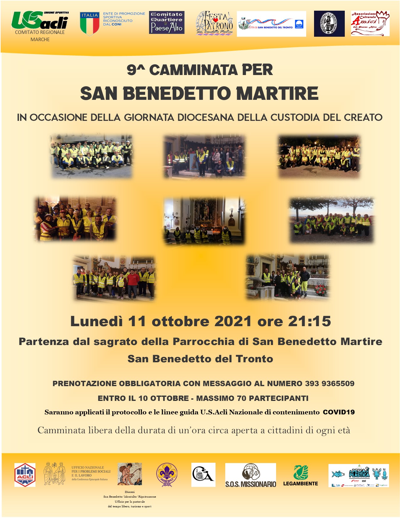 Con San Benedetto Martire, camminare insieme in una vita nuova…..E’ lo spirito in cui ci prepariamo per celebrare insieme la festa del nostro patrono anche attraverso un percorso a piedi per le vie ed i crocicchi delle strade della nostra bella città Lunedì 11 Ottobre ore 21.15 con partenza dalla Chiesa di San Benedetto Martire. Sarà anche occasione per riflettere “ nel tempo del creato” sulle problematiche ambientali e sociali che sono strettamente connesse, rese ancora più evidenti dal diffondersi del virus.Su questo tema così rilevante oggi, sono numerose le “buone pratiche”- esperienze del prenderci cura del creato e delle fragilità umane- sul fronte associativo, lavorativo, assistenziale, educativo, amministrativo e familiare esistenti nella città di San Benedetto del Tronto che rappresentano modelli virtuosi ed esempi da imitare.Lungo il cammino a piedi, daremo voce a queste “buone pratiche” a partire dalla visita presso i Padri minori Francescani della Chiesa di Sant’ Antonio che ci testimoniano che lo “ sguardo contemplativo” di San Francesco, è il punto di partenza originale che nasce dalla lode per il dono della creazione e si traduce nel prendersi cura delle ferite dell’altro e della casa comune secondo lo stile del buon Samaritano. Poi ci incammineremo costeggiando il Comune, le Istituzioni scolastiche e visitando la sede dell’ Associazione SOS Missionario , passeremo al porto per far visita ai pescatori con la loro iniziativa “ a pesca di plastica”, poi presso l’Associazione ACLI, la sede di Legambiente per poi tornare ad offrite tutta questa ricchezza e fermento di Bene Comune al nostro Patrono San Benedetto Martire.