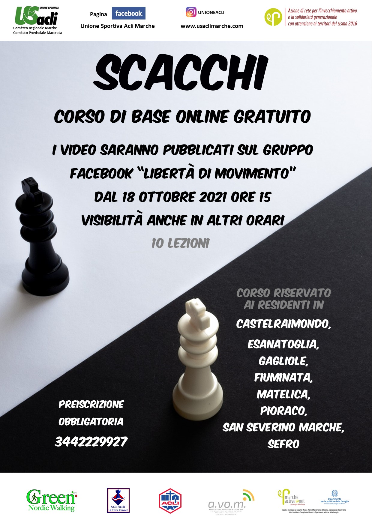 Nell’ambito dell’iniziativa “LIDMO – Libertà di movimento” che rientra nelle attività del bando del progetto “Marche_active@net – Al tempo del sisma” realizzato con il contributo della Presidenza del Consiglio dei Ministri – Dipartimento per le politiche della famiglia, proprio il 18 ottobre alle ore 15, prenderà il via un corso di base on line di scacchi, composto da 10 lezioni visibili anche in altro orari.