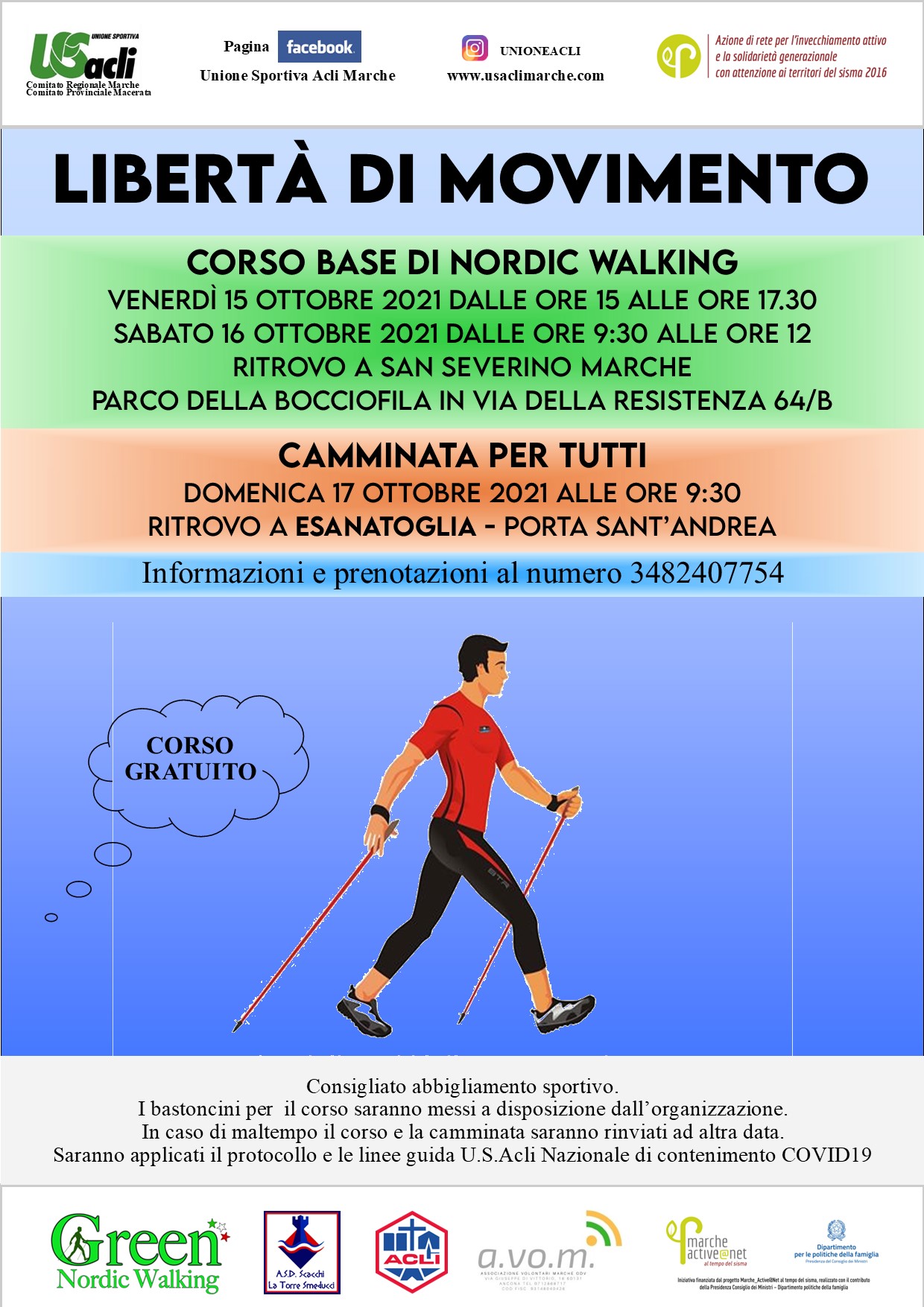 Tra le attività dell’iniziativa va segnalato un corso gratuito base di Nordic Walking che si svolgerà presso il parco della bocciofila in via della resistenza 64/b a San Severino Marche il 15 ottobre dalle ore 15 alle ore 17,30 ed il 16 ottobre dalle ore 9,30 alle ore 12.